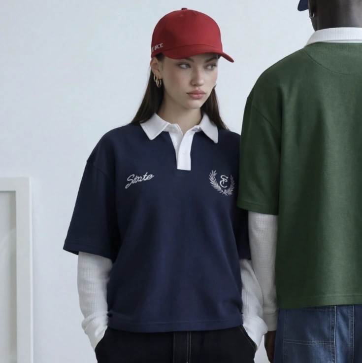 Crafted with a relaxed, boxy silhouette, it features a contrast inner sleeve layer paired with a clean polo collar, bringing together vintage prep and contemporary street culture. The premium embroidery and minimal branding add a refined edge, making it versatile for everyday wear or standout fits.