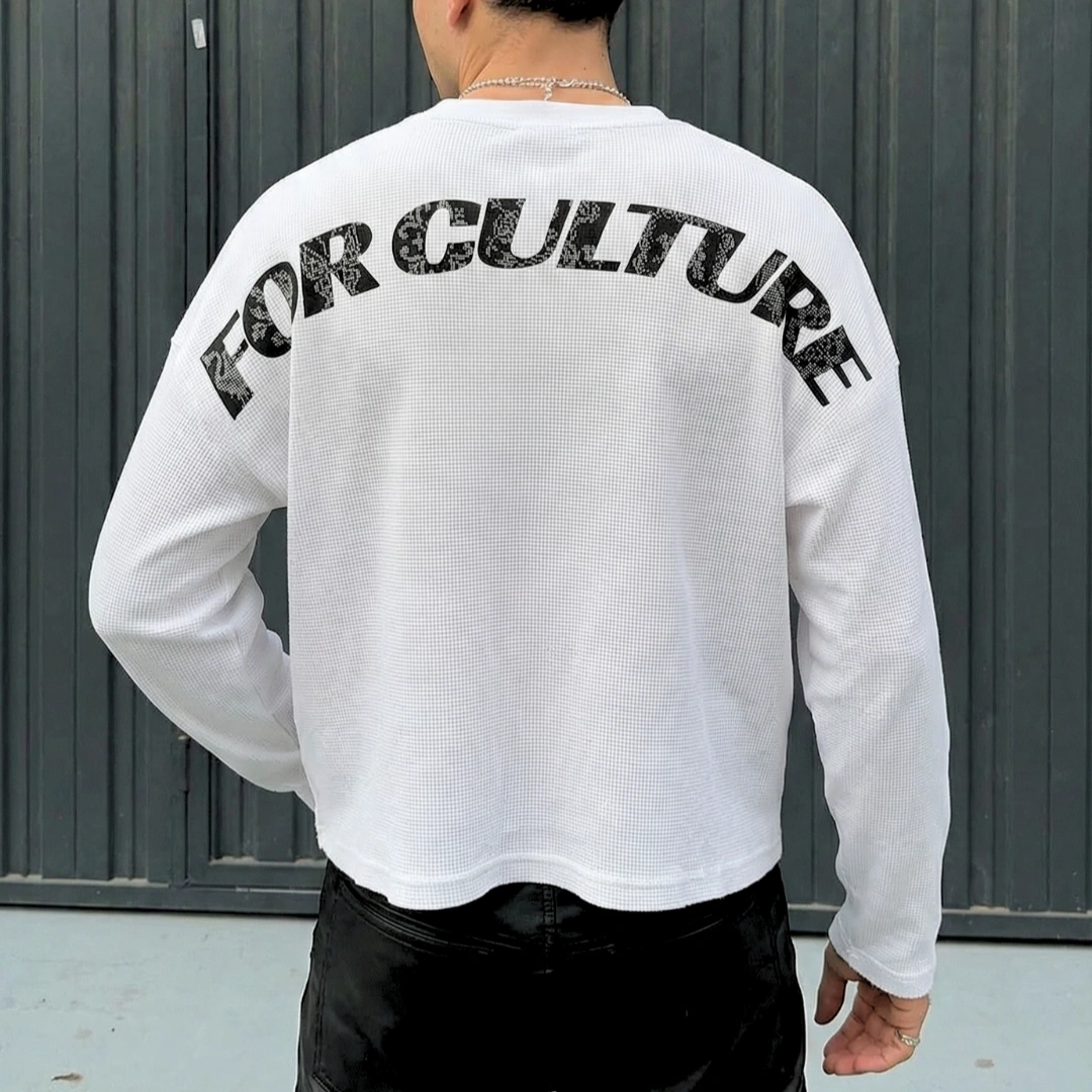 The FOR CULTURE Waffle Long Sleeve is crafted from lightweight cotton waffle fabric, delivering breathable comfort with a soft textured feel. Designed with a crop and boxy silhouette, it creates a clean, structured fit that sits naturally within modern streetwear.